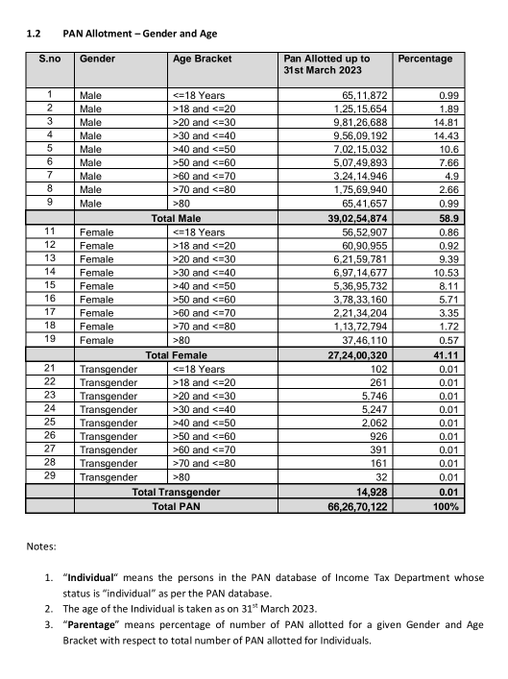 PAN allotment Statistics released based on Gender and Age Up to 31-03-2023. In this 66 crore pan issued, 39.02 crores are male, 27.24 crores are female and 14,928 are from the Transgender Community.