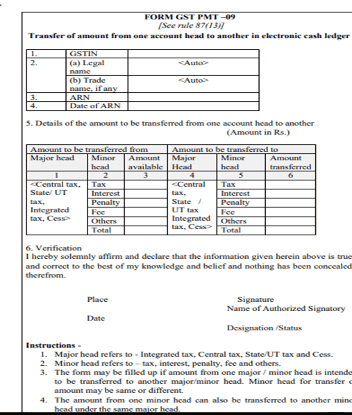A registered person may, on the common portal, transfer any amount of tax, interest, penalty, fee or any other amount available in the electronic cash ledger under the Act to the electronic cash ledger for integrated tax, central tax, State tax or Union territory tax or cess in FORM GST PMT-09..