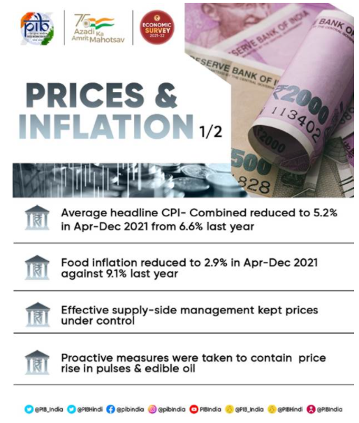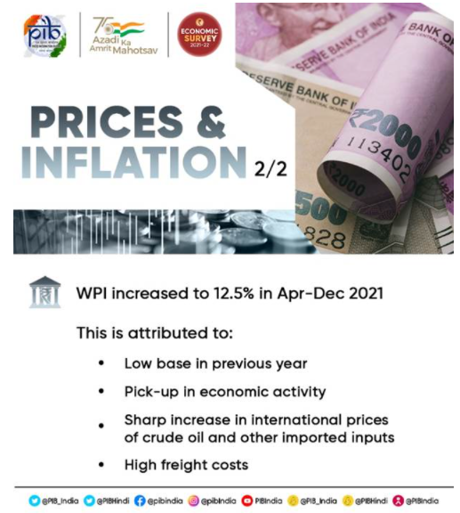 The Survey mentions that Inflation in the above two groups for the period of 2021-22 (April – December) has been largely due to the high international crude oil, petroleum product prices and higher taxes.