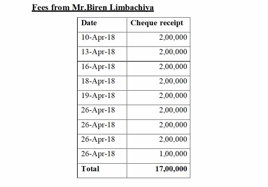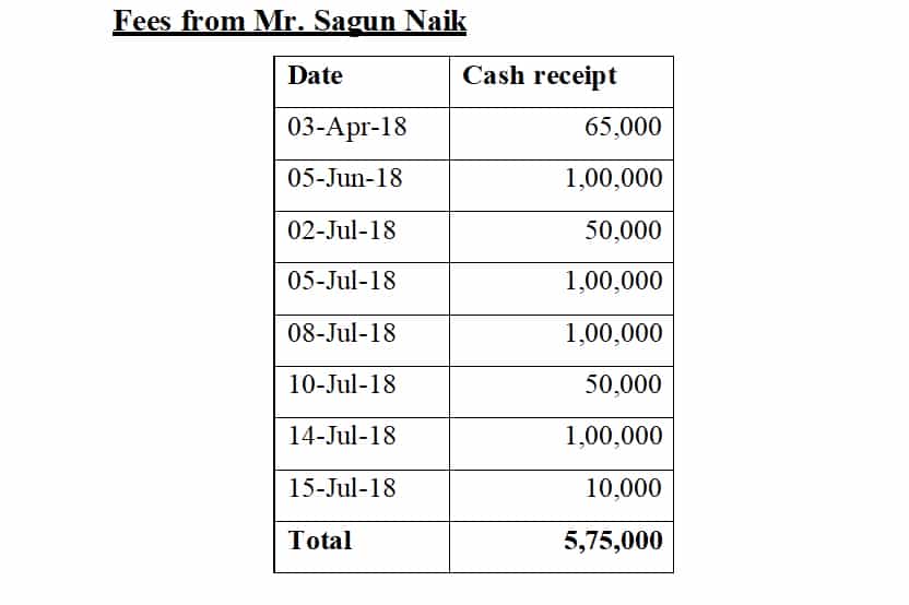 The ld. AR submitted that with regard to amount received from Shri Sagun Naik the assessee has given the date wise breakup of receipt of fees in cash which would tie up with the cash book and the ledger accounts of professional fees. The ld. AR further submitted that Mr. Sagun Naik has confirmed having made this payment and the same along with his PAN Number and other details were already submitted before the lower authorities. With regard to amount received from Shri Biren Limbachiya the ld. AR submitted entire amount of fees is received in cheque and has been properly accountant in the books of accounts. The ld. AR further submitted that the assessee had withdrawn cash on various dates prior to travel Delhi which can be evidenced from the bank statement and the cash books that are submitted before the lower authorities. The ld. AR also submitted that both these amounts have been included in the professional fee income of the assessee and have been included in the taxable income. It is therefore, submitted that the same cannot be treated as undisclosed income.