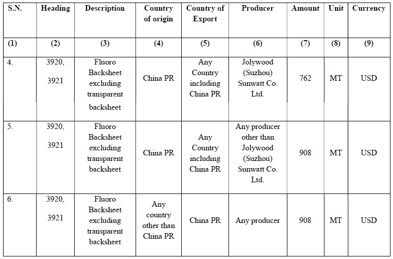 G.S.R.—(E). – Whereas, in the matter of “Fluoro Backsheet excluding transparent backsheet” (hereinafter referred to as the subject goods), falling under tariff headings 3920 and 3921 of the First Schedule to the Customs Tariff Act, 1975 (51 of 1975) (hereinafter referred to as the Customs Tariff Act), originating in, or exported from the China PR (hereinafter referred to as the subject country) and imported into India, the Designated Authority in its final findings, vide, notification F. No. 6/3/2021-DGTR, dated the 29th March, 2022, published in the Gazette of India, Extraordinary, Part I, Section 1, dated the 29th March, 2022, has come to the conclusion that-