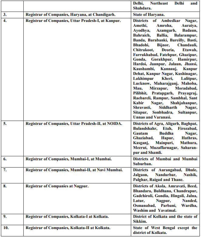 The Central Government, under the powers granted by sub-sections (1) and (2) of the Limited Liability Partnership Act 2008 (6 of 2009), has established 10 Registrar of Companies (ROC) offices across different locations in India. The ROC is responsible for approving new company registration, maintaining company records, issuing Certificate of Incorporation, monitoring compliance, etc.