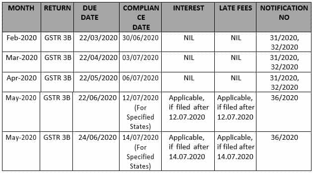 | April 03, 2020 | CBIC | Notification No. 32/2020 – Central Tax | Seeks to provide relief by conditional waiver of late fee for delay in furnishing returns in FORM GSTR-3B for tax periods of February, 2020 to April, 2020. |