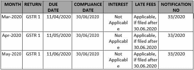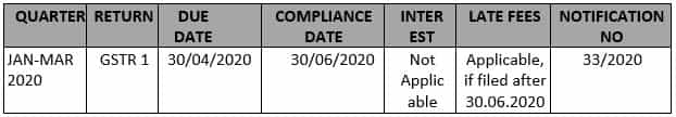 | April 03, 2020 | CBIC | Notification No. 33/2020 – Central Tax | Seeks to provide relief by conditional waiver of late fee for delay in furnishing outward statement in FORM GSTR-1 for tax periods of February, 2020 to April, 2020. |