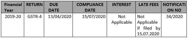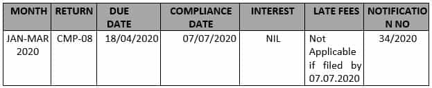 | April 03, 2020 | CBIC | Notification No. 34/2020 – Central Tax | Seeks to extend due date of furnishing FORM GST CMP-08 for the quarter ending March, 2020 till 07.07.2020 and filing FORM GSTR-4 for FY 2020-21 till 15.07.2020. |