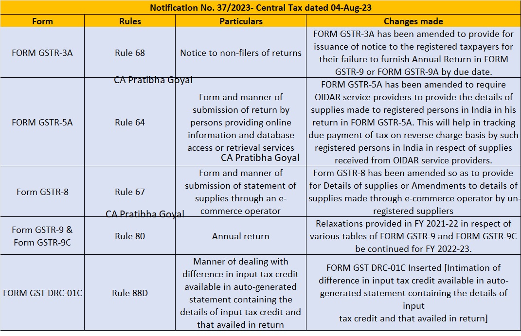 Changes notified in various GST Forms: Notification No. 37/2023- Central Tax dated 04-Aug-23