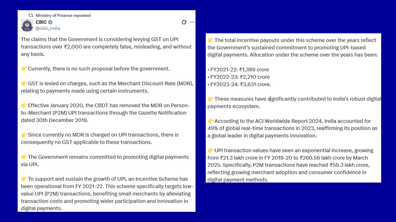 The Central Board of Indirect Taxes and Customs (CBIC)  took it’s twitter handle to clarify that the claims that the Government is considering levying GST on UPI transactions over Rs. 2,000 are completely false, misleading, and without any basis.