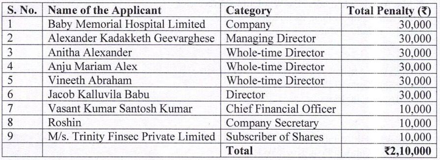 ROC has issued an Adjudication order against Baby Memorial Hospital Limited for not dematerialising Securities held by promoters, directors, and key managerial personnel.