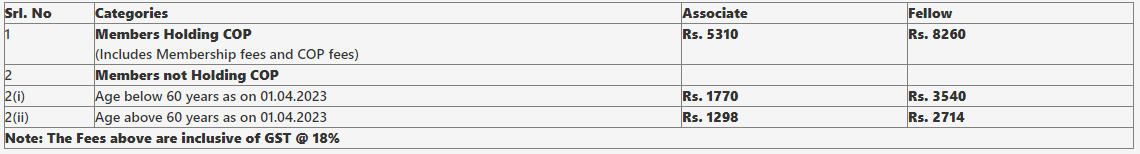 ICAI had released a Fee Circular in may 2023 urging members to pay Annual Membership Fees or Certificate of Practice fees for the year 2023-2024. These fees became payable on April 1, 2023, and must be paid by September 30, 2023. All Members are requested to pay the fee immediately as Tax Invoice (in terms of GST Liability) has been already generated. The applicable amount of Annual Membership/Certificate of Practice Fee including GST is given below.
