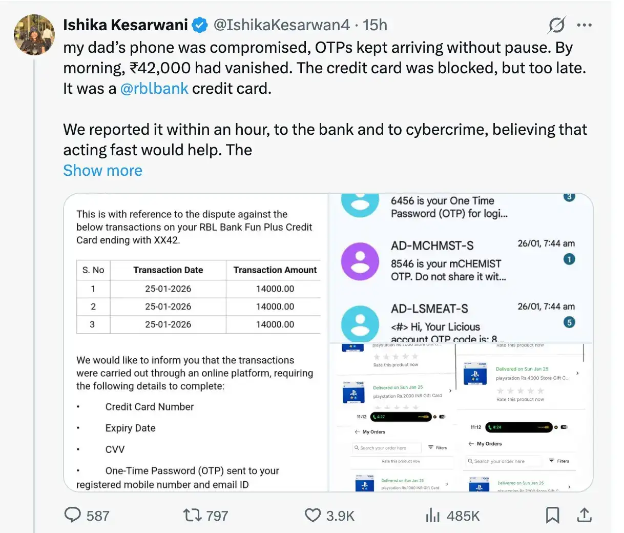 The response sparked widespread criticism online. The user questioned why fraud monitoring systems didn’t flag multiple OTP-based transactions occurring in rapid succession. She also asked what the purpose of these systems is if they fail to prevent such obvious fraudulent activity in real time.