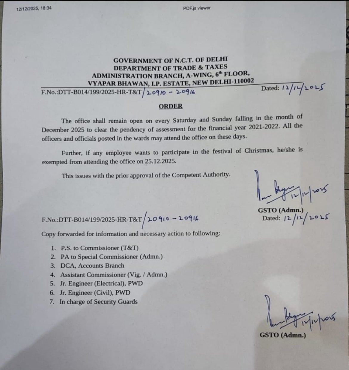 The Delhi State GST Department has issued an order to remain open on Saturdays and Sundays throughout December 2025 to clear the pending assessments for the Financial Year 2021-22.
