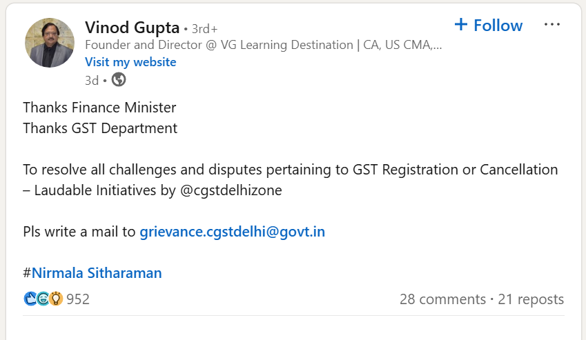 In a recent post shared by CA Vinod Gupta, he expressed gratitude to the Finance Minister and the CGST Delhi Zone for solving issues related to GST registration and cancellation. Further, he also encouraged other taxpayers to reach out to the CGST Delhi Zone.