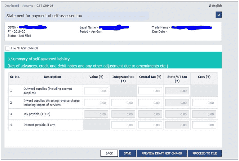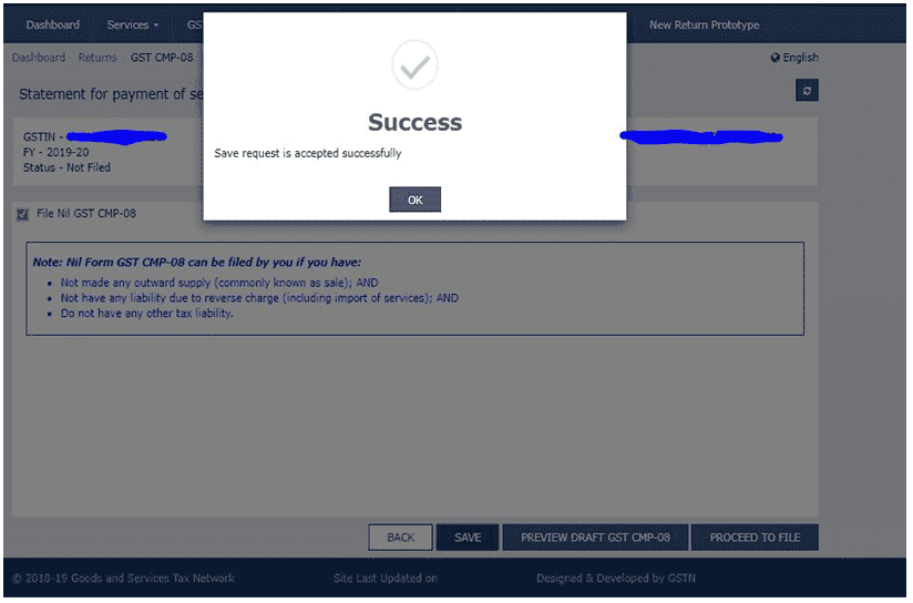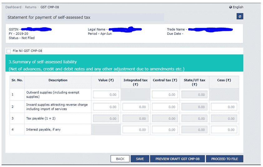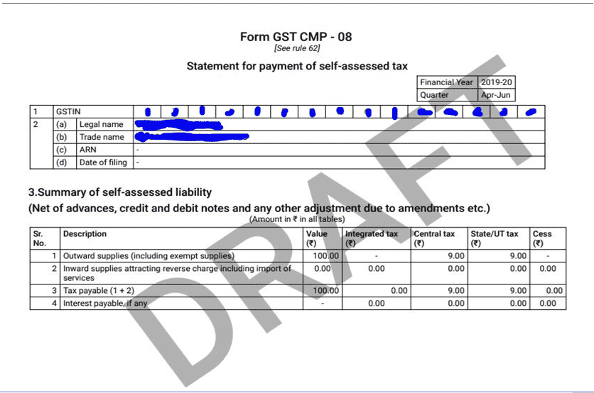 Such specified persons are required to furnish their return statement with the help of Form GST CMP-08 on a quarterly basis (on or before the 18th of the month following the quarter of any given financial year). GST CMP 08 form extended due date is 31st July for the quarter of April 2019 to June 2019.