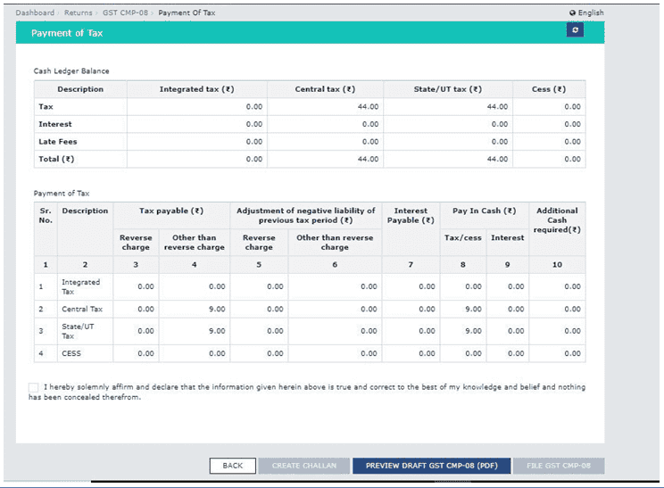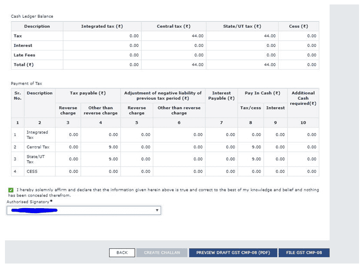 IX. If sufficient balance is available in cash ledger then click on File GST CMP-08, if not then click on Create Challan and paid the tax liabilities accordingly.