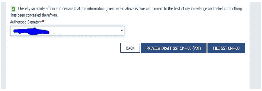 VII. After clicking on Preview Draft GST CMP-08 then click on File GST CMP-08 to file the form, Taxpayer can file the form as per applicability (EVC or DSC).