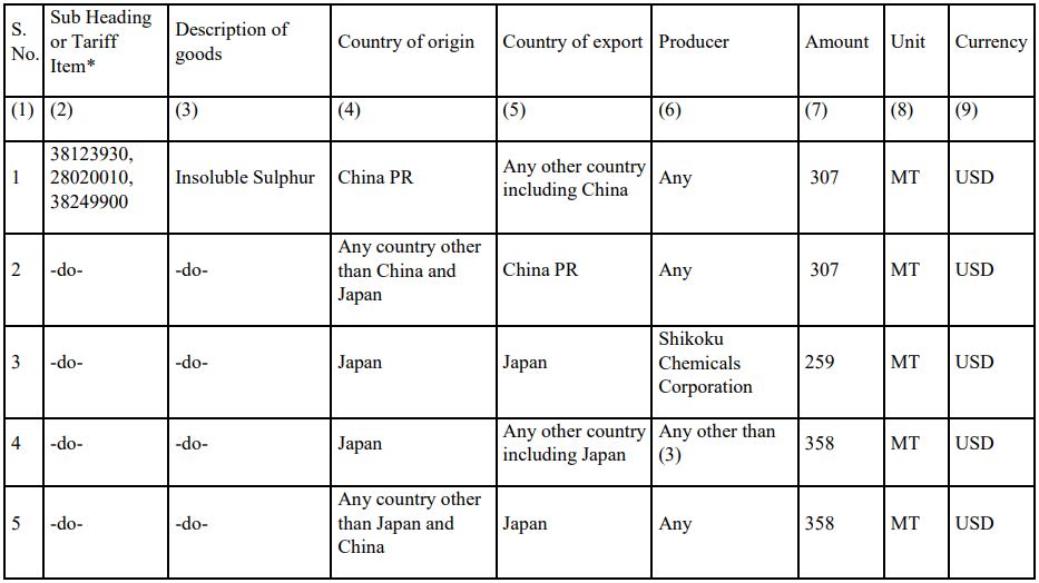 The Ministry of Finance released an official notification dated June 6, 2025, regarding the matter the “Insoluble Sulphur”. The Ministry has announced the imposition of anti-dumping duties on imports of Insoluble Sulphur originating from China and Japan, following an investigation by the Directorate General of Trade Remedies (DGTR).