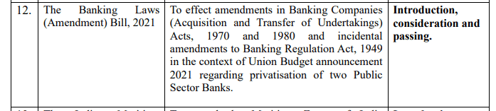 This Bill is one of 26 new Bills on the government’s legislative agenda, out of a total of 29 Bills. To effect amendments in Banking Companies (Acquisition and Transfer of Undertakings) Acts, 1970 and 1980 and incidental amendments to Banking Regulation Act, 1949 in the context of Union Budget announcement 2021 regarding privatisation of two Public Sector Banks.