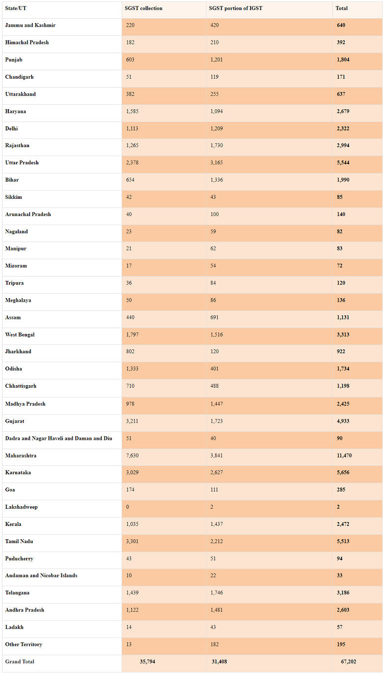 From IGST, the government has transferred Rs.37,581 crore to CGST and Rs.31,408 crore to SGST. After normal settlement, the total income of the Centre and the States in the month of August 2023 is Rs.65,909 crore for CGST and Rs.67,202 crore for SGST.