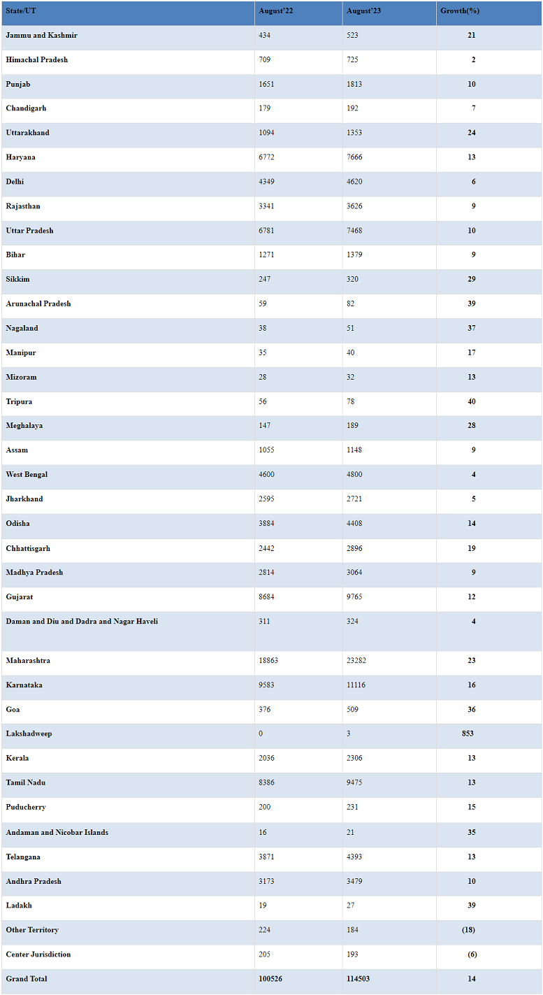 State-wise Y-o-Y growth of GST Revenue in August, 2023 (Rs. In crore)