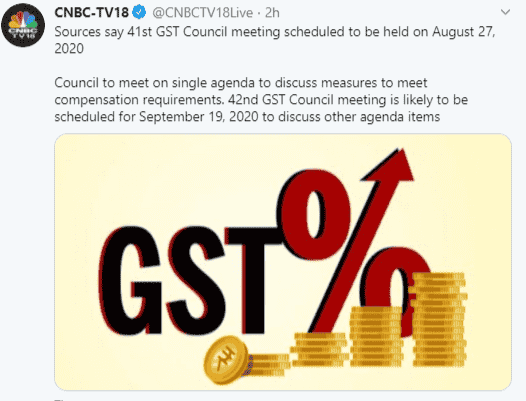 As per CNBC-TV18 Twitter handle 41st GST Council meeting scheduled to be held on August 27, 2020.