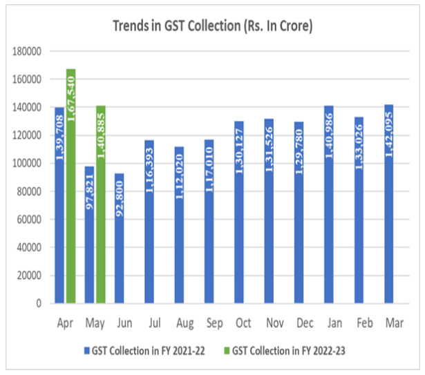 The revenues for the month of May 2022 are 44 percent more than the GST collections of 97,821 crore in the same month last year. Revenues from imports of products were 43 percent higher during the month, and revenues from domestic transactions (including imports of services) were 44 percent higher than in the same month last year.