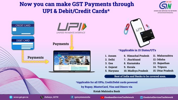 The Goods and Services Tax Network (GSTN) has issued an update that GST Payments can be made through UPI and Debit/Credit Cards in 15 states/UTs.