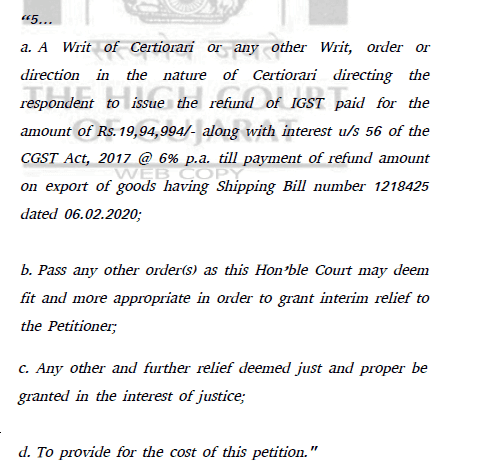 It is the say of the petitioner that the provision of Sections 16 and 54 of the IGST Act and Rule 96 of the CGST Rules if are considered, then the amount claimed as refund would become due to the petitioner and an order need to be passed by the respondent sanctioning 90% of the amount claimed in Form RFD-04 within a period of not exceeding 07 days from the date of acknowledgment received. The refund applications as per Rule 96 of the CGST Rule, 2017 are the payment of tax and shipping bills once the goods are imported with payment of tax. However, the respondent had not issued the order and hence, this petition with the following prayers: