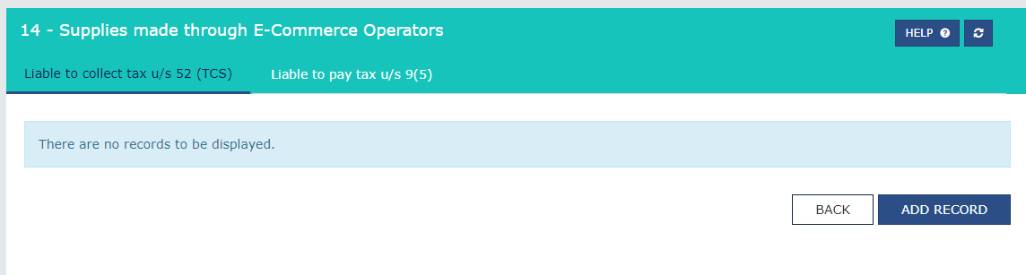 ‘Liable to pay tax u/s 9(5)’ – This tab shall be display on table 14, you can add record by click on this tab. Please report here the summary of the supplies made through E-commerce operators covered under sec 9(5).