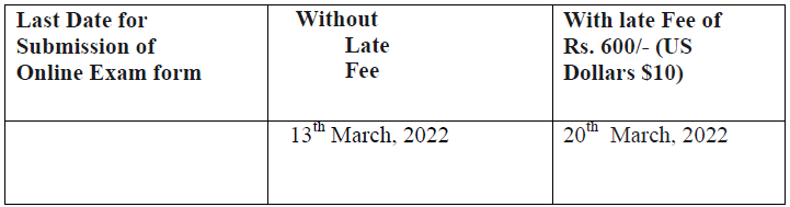 (iii) Last Date for Receipt of Printout of Exam Application form (PDF) filled Online after affixing photograph and specimen signature (if the same are not appearing in the pdf) and signing the declaration duly counter signed by a member of the Institute/Principal/Gazetted Officer is 24th March, 2022.