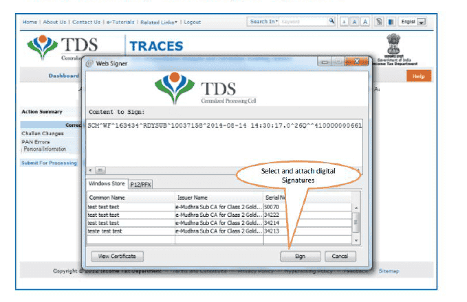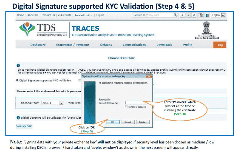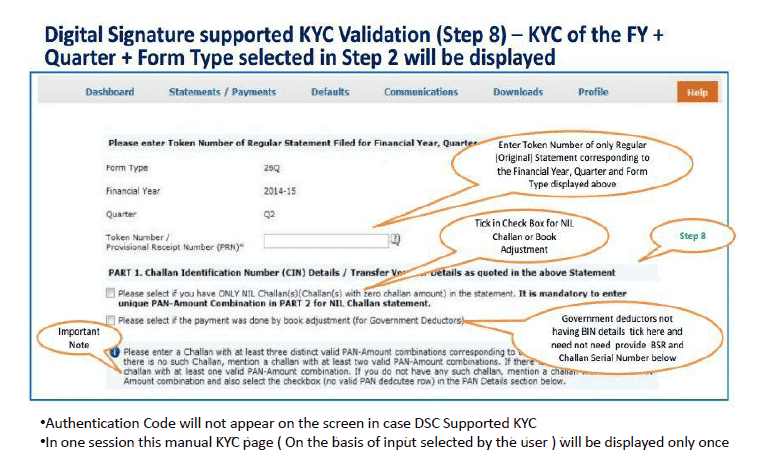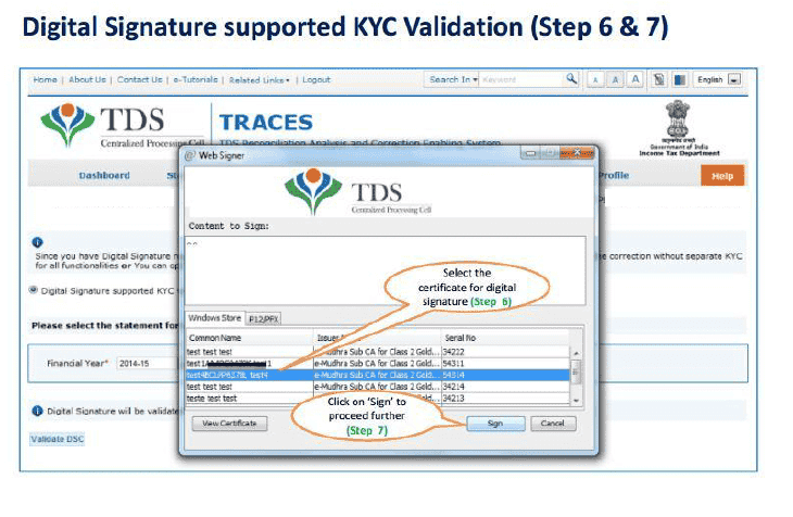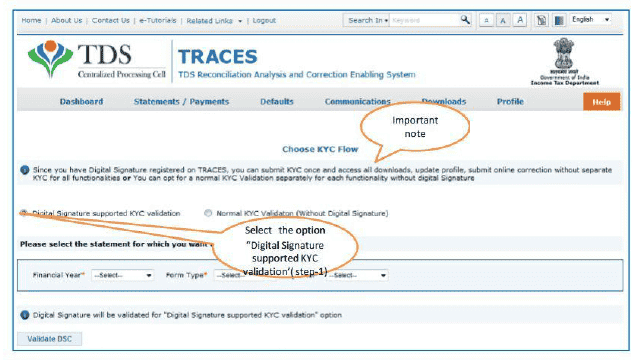 Digital Signature Support KYC validation screen will appear only if Digital Signature is registered. Deductor can register/re register their Digital Signature in Profile. Please refer Digital Signature Certificate Registration e-Tutorial for more information.