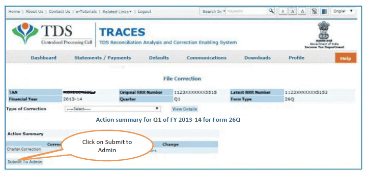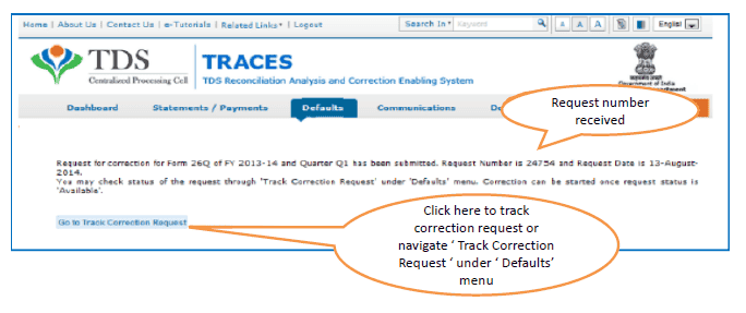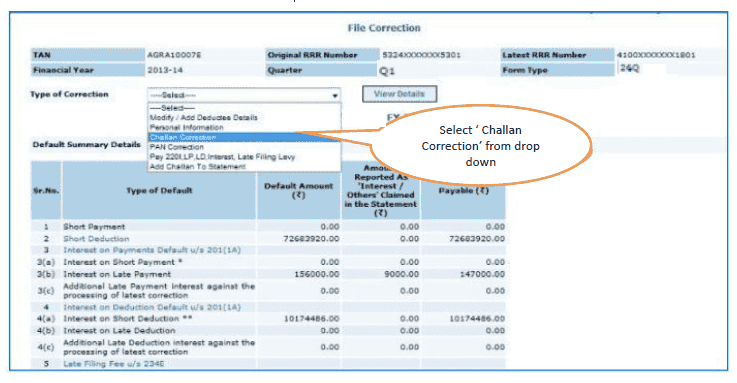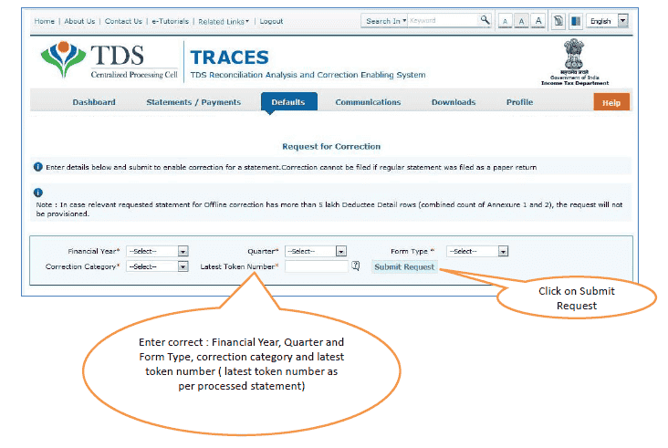 (a) Go to Request for correction under Defaults by entering relevant Quarter, Financial Year, Form Type , Latest Accepted Token number.
