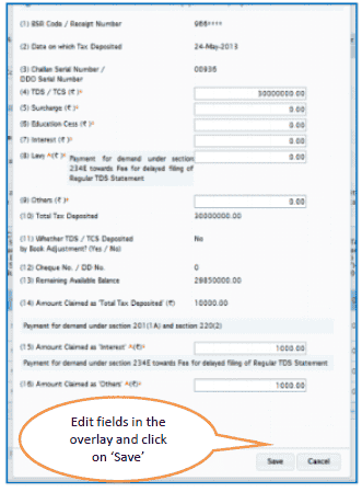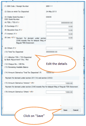 5. Interest amount in the challan / BIN from the statement filed by deductor with regards to the statement selected for filing correction. Amount should not be editable for BINs.