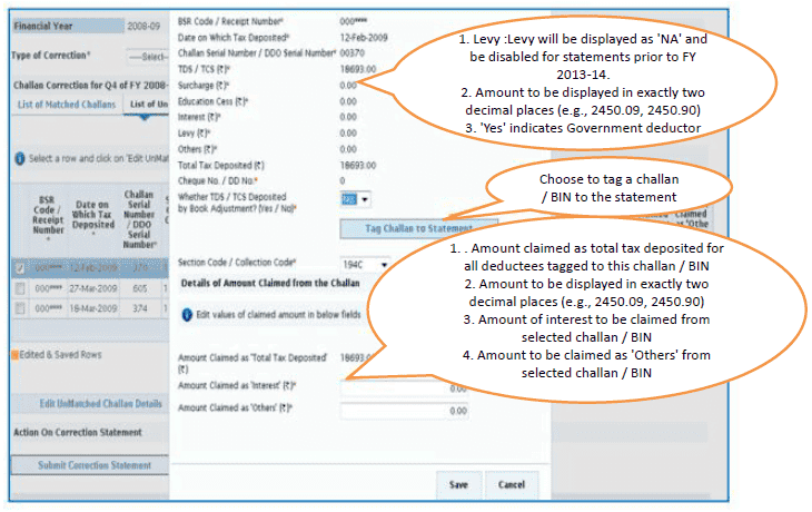 4. Education Cess amount of challan / BIN from the statement filed by deductor with regards to the statement selected for filing correction. Amount should not be editable for BINs.