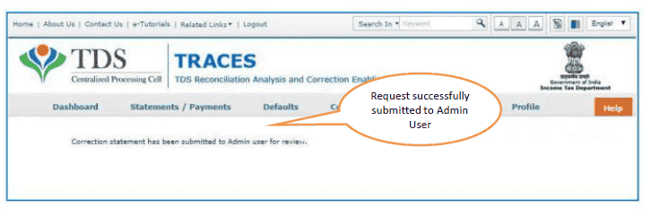 6. Submitted to Admin User-Sub-user / Admin User has submitted correction statement to Admin User
