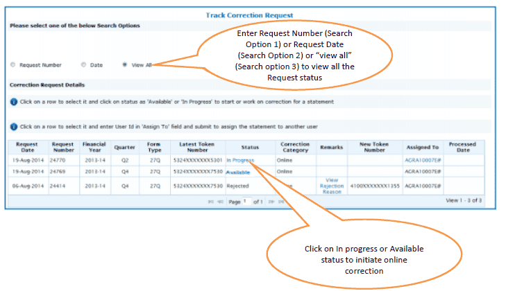 Available Status – Request for correction is accepted and statement is made available for correction. User can start correction on the statement. Clicking on the hyperlink will take user to validation screen. Once user clicks on request with ‘Available’ status, status of request / statement will change to ‘In Progress.