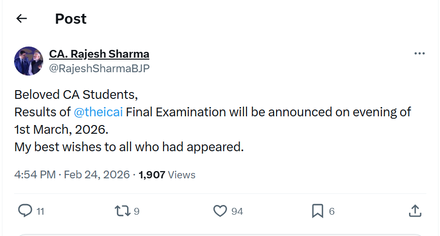 As per the tweet shared by CA. Rajesh Sharma, the Central Council Member of ICAI, said the result for the ICAI CA Final January 2026 will be announced on the evening of March 1, 2026.