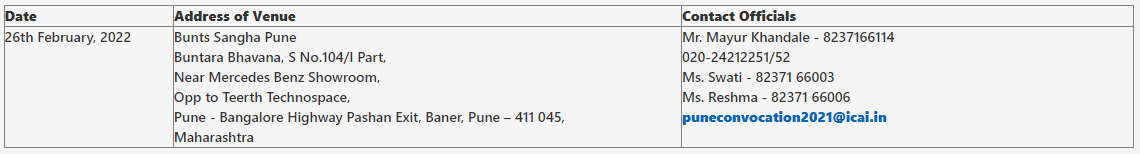 The ICAI Convocation, which was originally scheduled in January, 2022 at Pune and postponed, has now been held on 26th February, 2022 for Members who are enrolled during the period from November 2019 to August 2021. They will be awarded Certificate of Membership in this Convocation: The Venue and other details are as under;
