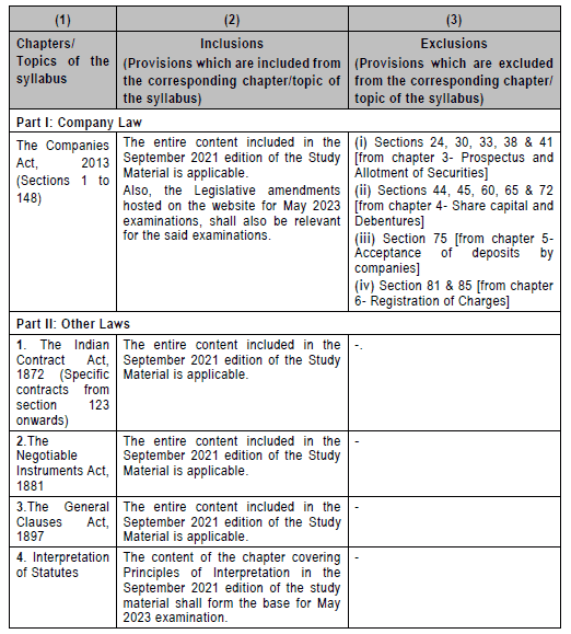 The relevant notified Sections of the Companies Act, 2013 and legislative amendments including relevant Notifications / Circulars / Rules / Guidelines issued by Regulating Authorities up to 31st October, 2022 will be applicable for May, 2023 Examination.