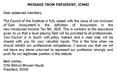 The Institute of Cost Accountants of India (ICMAI) president, in a message, speaks on the inclusion of CMAs for tax audits in the newly introduced bill.