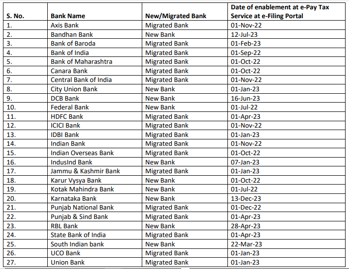 List of banks for tax payments available at e-Pay Tax service at e-Filing Portal: