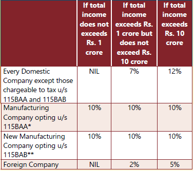 Note: Where the company is a unit located in International Financial Services Centre and derives its income solely in convertible foreign exchange, the Minimum Alternate Tax is levied at a rate of 9% (plus surcharge and cess as applicable).