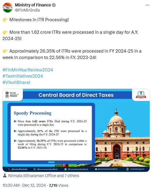 In a historic milestone, the Tax Department of India processed over 1.62 crore Income Tax Returns (ITRs) in a single day for the Assessment Year (AY) 2024-25.