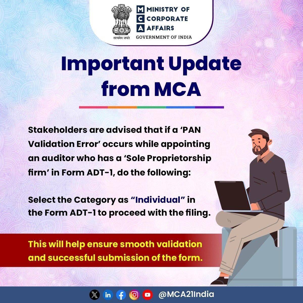 The Ministry of Corporate Affairs (MCA) announces an important update to resolve the ‘PAN Validation Error’ in Form ADT-1 for Sole Proprietor Auditors.