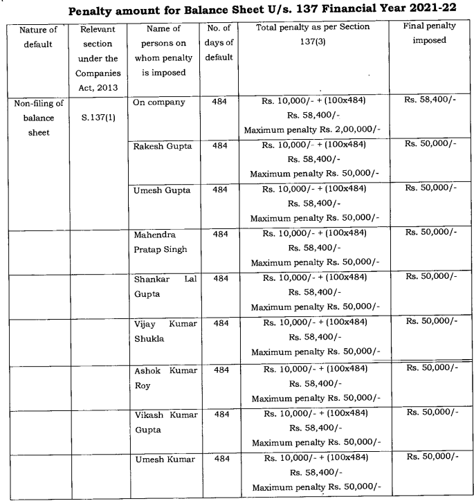 Whereas as per information available on MCA21 data base, the company has not filed its statutory document i. e. Balance Sheet since 2019 to till date under Section 137(1) of the Companies Act, 2013. Hence, it appears that the company and its officers in defaults has violated the provisions of Section 137(1) of the Companies Act, 2013 and are liable for penal action u/ s. 137(3) of the Companies Act, 2013 for financial year 2018-19 to till date.
