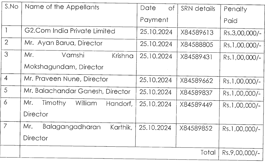 After reviewing the appeal and submissions, the regional director reduced the penalty to Rs 3,00,000 on the company and Rs 1,00,000 on each 6 directors. The appeal is disposed of now. The details of the revised penalty paid by the company and its director are as follows: