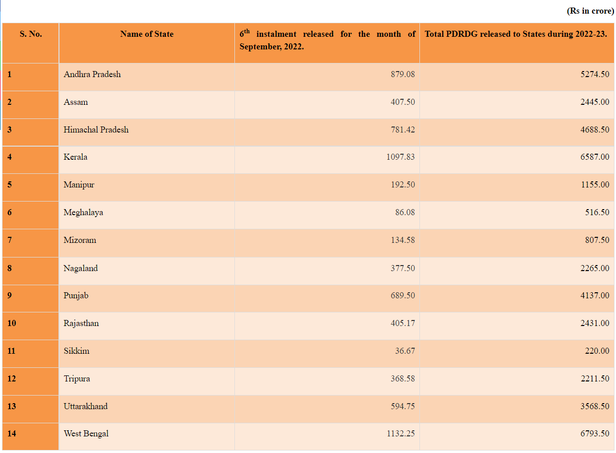 The Department of Expenditure, Ministry of Finance has on Tuesday released the 6th monthly instalment of Post Devolution Revenue Deficit (PDRD) Grant of Rs. 7,183.42 crore to 14 States. The grant has been released as per the recommendations of the Fifteenth Finance Commission.