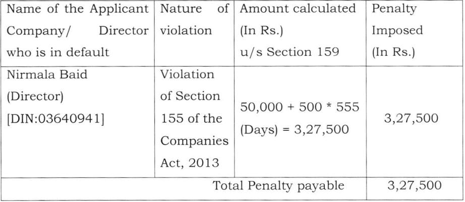 The Registrar of Companies (ROC), West Bengal, has imposed a penalty of Rs. 3,27,500 on a director named Nirmala Baid for violating Section 155 of the Companies Act, 2013, passed by the Adjudicating Authority, i.e., the Registrar of Companies, Kolkata, West Bengal, under Section 159 of the Act for failure to comply with the Act u/s. 155 of the Act.