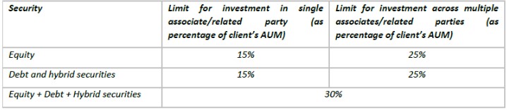i. Portfolio Manager shall invest up to a maximum of 30 percent of their client’s portfolio (as a percentage of the client’s assets under management) in the securities of their own associates/ related parties. Further, the Portfolio Manager shall ensure compliance with the following limits:
