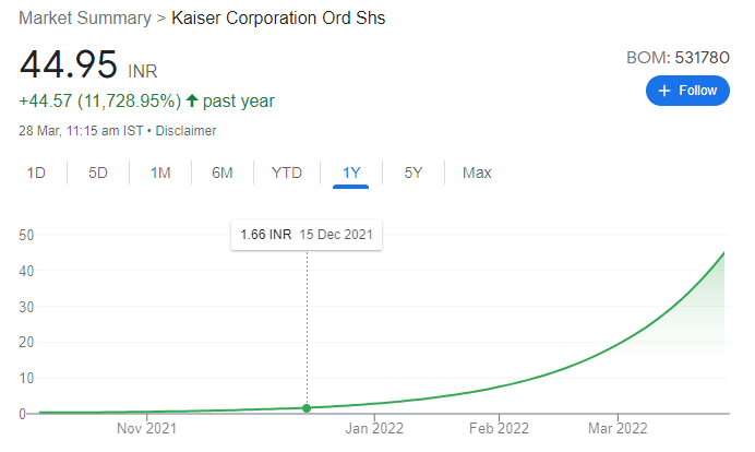 In a year, this stock has increased from 38 paise (closing price on 12 April 2021 BSE) to Rs 44.95 per share on Monday (28 March 2022). The company’s stock has given a tremendous return of 11,728.95 per cent in a year. At the same time, this packaging multibagger share has given a return of 1,367.47 percent in the year 2022 so far. Shares of Kaiser Corporation Ltd., which were at Rs 2.92 on BSE on January 3, 2022, have now increased to Rs 44.95. The stock was priced at Rs 19 a month ago, during which it has given a return of around 125.41%.