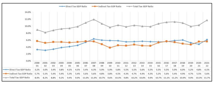 Tax collection has a direct positive correlation with GDP growth. 2021-22 marks the highest tax-GDP ratio of 11.7%, as previously highlighted. The tax buoyancy (which is a measure of growth in tax revenues as compared to GDP growth) is at a very healthy figure of 1.9, with 2.8 for direct taxes and 1.1 for indirect taxes. The ratio of direct to indirect taxes recovered from 0.9 in 2020-21 back to 1.1 in 2021-22.